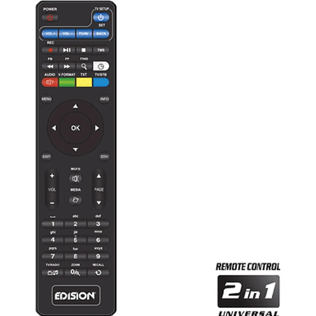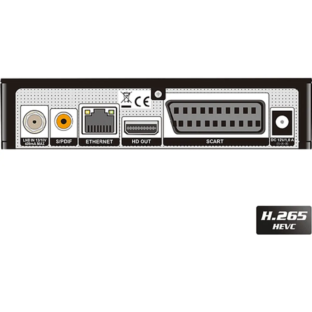O receptor de satélite DVB-S2 com descodificação H.265/HEVC oferece suporte a várias resoluções de vídeo, incluindo FullHD, com conectividade LAN, HDMI, USB e Scart. Inclui leitor de cartão, saída S/PDIF, Wi-Fi (via dongle) e opcional 3G via modem USB, permitindo streaming de TV, filmes, música e fotos para smartphones ou tablets Android com Big2Small e MX Player. Possui PVR via USB, Time Shift, Guia Eletrónico de Programação EDIVISION, edição de listas de canais e preferências, e atualizações de software via USB.