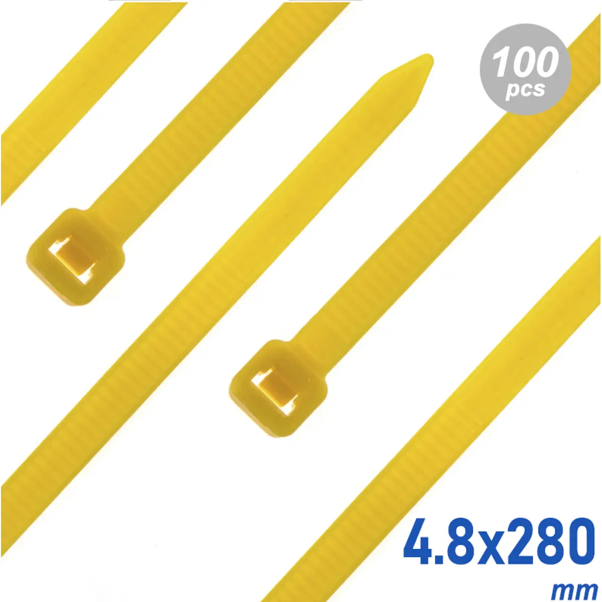 Conjunto de abraçadeiras de fivela amarelas, com 280 mm de comprimento e 4,8 mm de largura, compatíveis com diâmetros de Ø3,5 mm a Ø74 mm, e resistência à tensão de 28 kg. Embaladas em packs de 100 unidades, destacam-se pela cor amarela.