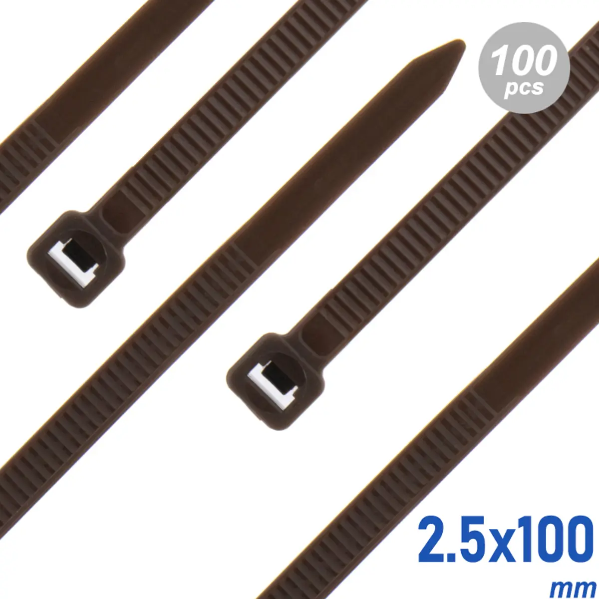 Abraçadeiras de fivela para fixação rápida de cabos e tubos, fornecidas em embalagem de 100 unidades, de cor castanha. Possuem comprimento de 100 mm e largura de 2,5 mm, compatíveis com diâmetro entre 3 e 25 mm. Oferecem resistência à tensão de 11 kg, ideais para organização e fixação segura em ambientes domésticos, industriais ou de bricolage. Práticas, resistentes e fáceis de usar em várias aplicações.