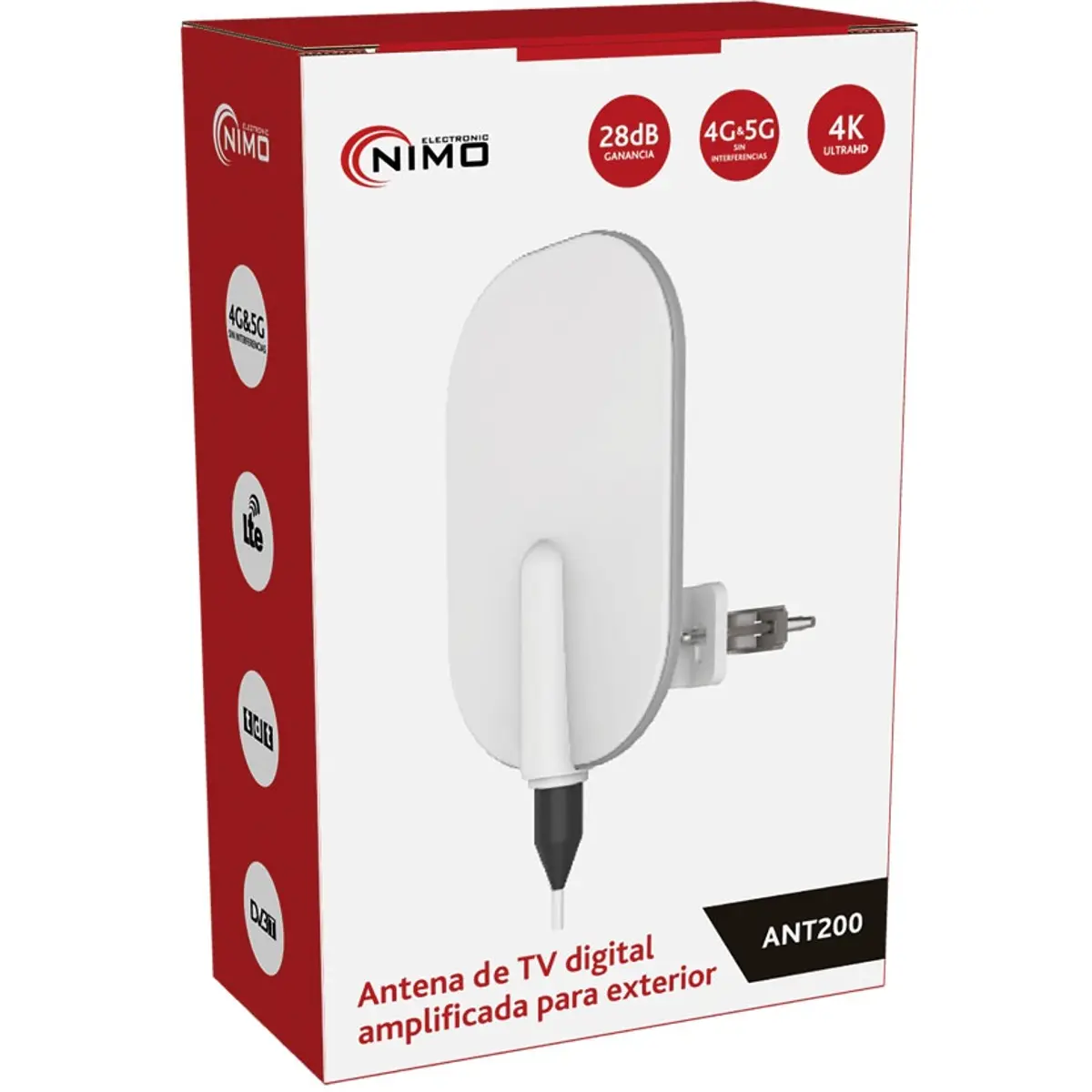 A ANT200 da NIMO é uma antena de TV exterior para receção de TDT com design de perfil plano e dimensões compactas, sem os tradicionais elementos radiais salientes. O seu formato discreto permite instalação em varandas, mastros ou paredes com reduzido impacto visual.