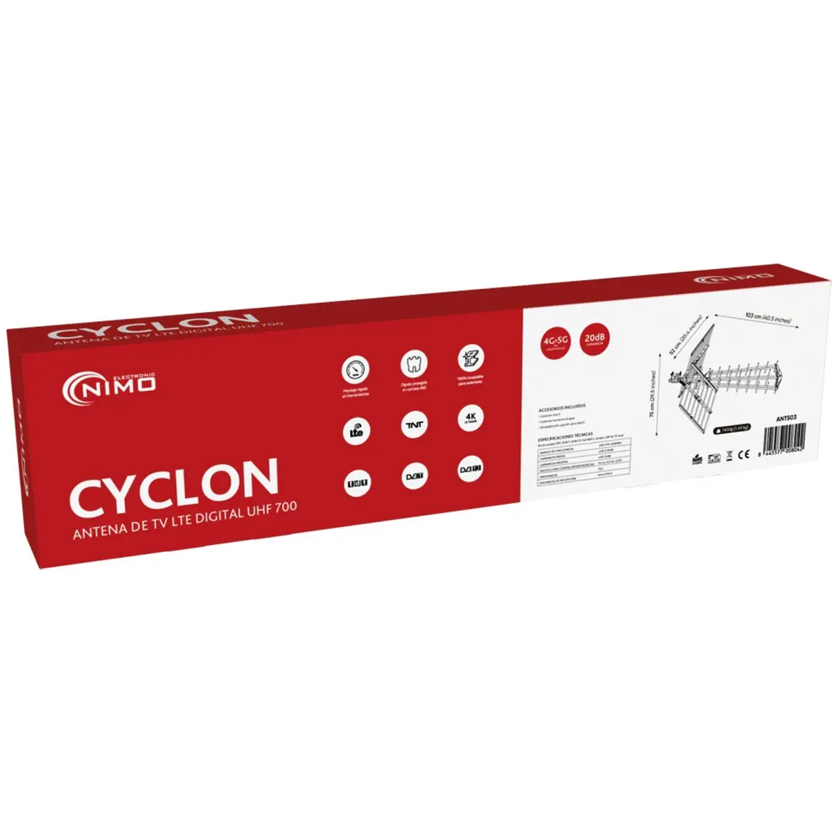 A NIMO CYCLON (ANT503) é uma antena exterior de alto desempenho, concebida para a receção de sinais TDT em UHF com elevada estabilidade e qualidade. Equipada com filtro LTE 4G/5G integrado, garante uma receção limpa, minimizando interferências provenientes das redes móveis.