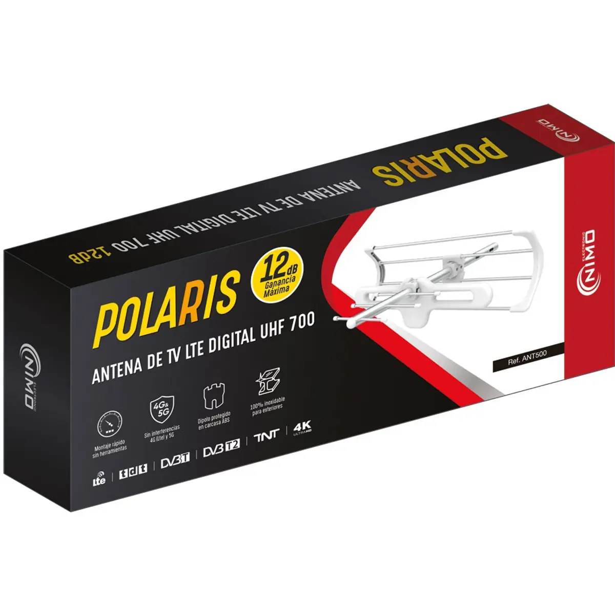 A NIMO POLARIS (ANT500) é uma antena exterior de alto desempenho, desenvolvida para a receção de sinais de Televisão Digital Terrestre (TDT) na banda UHF. Com filtro 4G/LTE e 5G incorporado, garante uma receção estável e protegida contra interferências provenientes das redes móveis mais recentes.