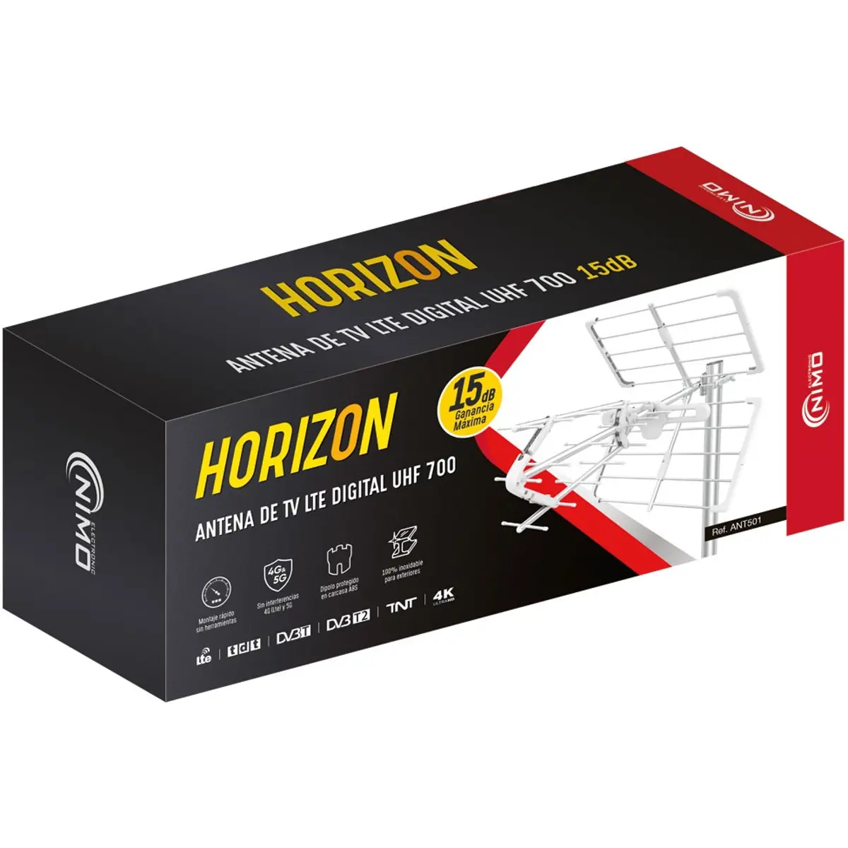 A Antena TV Exterior NIMO HORIZON ANT501 foi especialmente concebida para a receção de sinais TDT na banda UHF, integrando filtro LTE/5G para minimizar interferências provenientes de redes móveis. Com estrutura robusta, materiais leves e resistência às intempéries, é uma solução fiável para instalações exteriores residenciais ou profissionais.