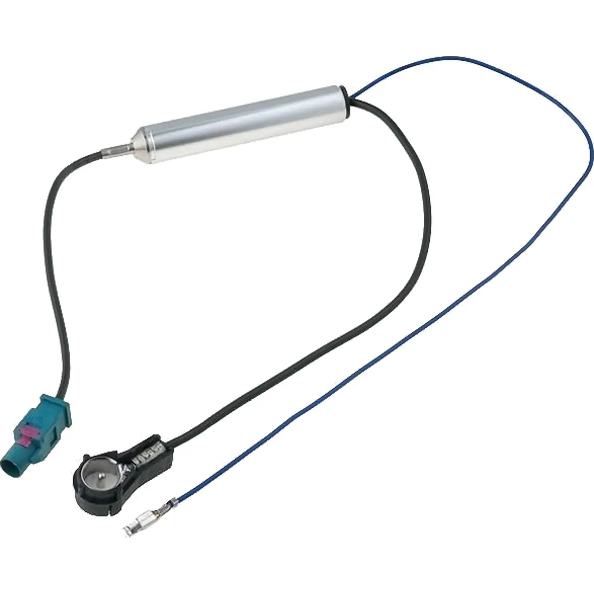 Amplificador de antena para auto-rádio com conectores ISO macho de 90º e Fakra, concebido para melhorar a receção de sinal em veículos compatíveis. Compatível com Audi, Fiat, Mercedes, Peugeot, Seat, Skoda e VW (modelos 2002 em diante), este acessório facilita a instalação e a integração com sistemas de rádio automóvel, oferecendo uma solução simples para quem procura melhorar a qualidade de sinal sem alterações complexas.