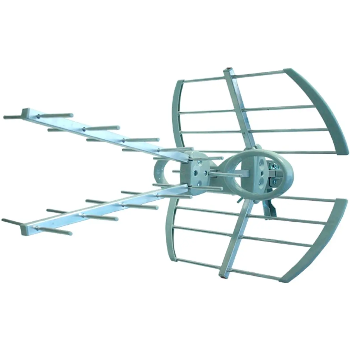 Antena UHF com alcance de 470-694 MHz, oferece ganho de 13 dB, comprimento de 745 mm e ângulo de abertura horizontal de 38°. Suporta 21-60 canais e carga ao vento de 35 N (130 km/h). Possui conector F e está preparada para LTE, ideal para instalações externas, garantindo robustez e melhor desempenho de sinal.