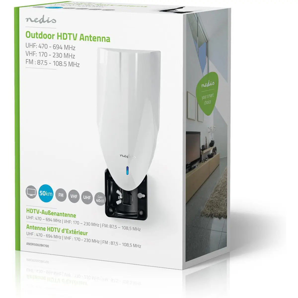 Antena Nedis® DVB-T / T2 de interior ou exterior garante recepção estável de canais analógicos ou digitais e sinais de rádio FM. A antena tem um design compacto e elegante, sem chamar muita atenção.