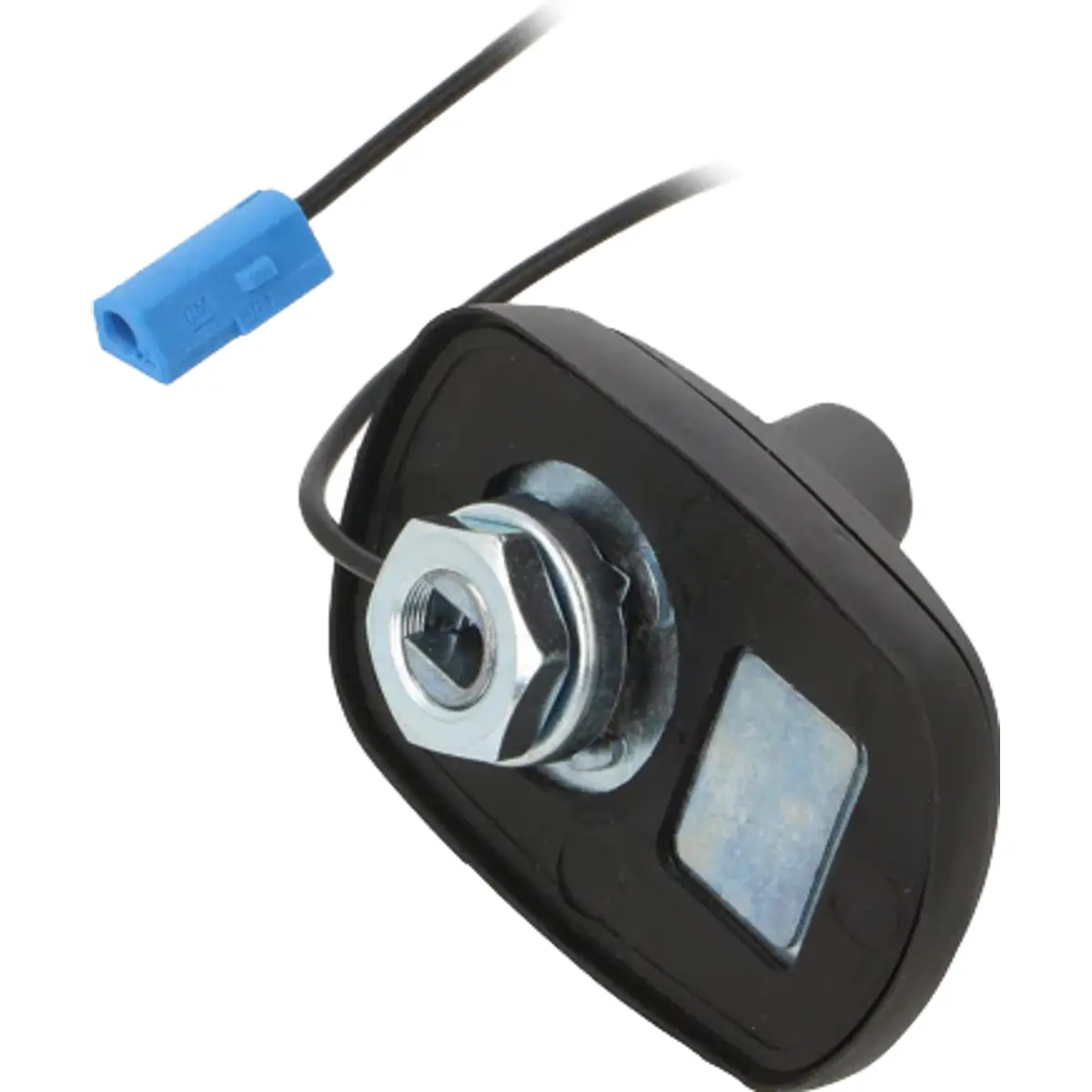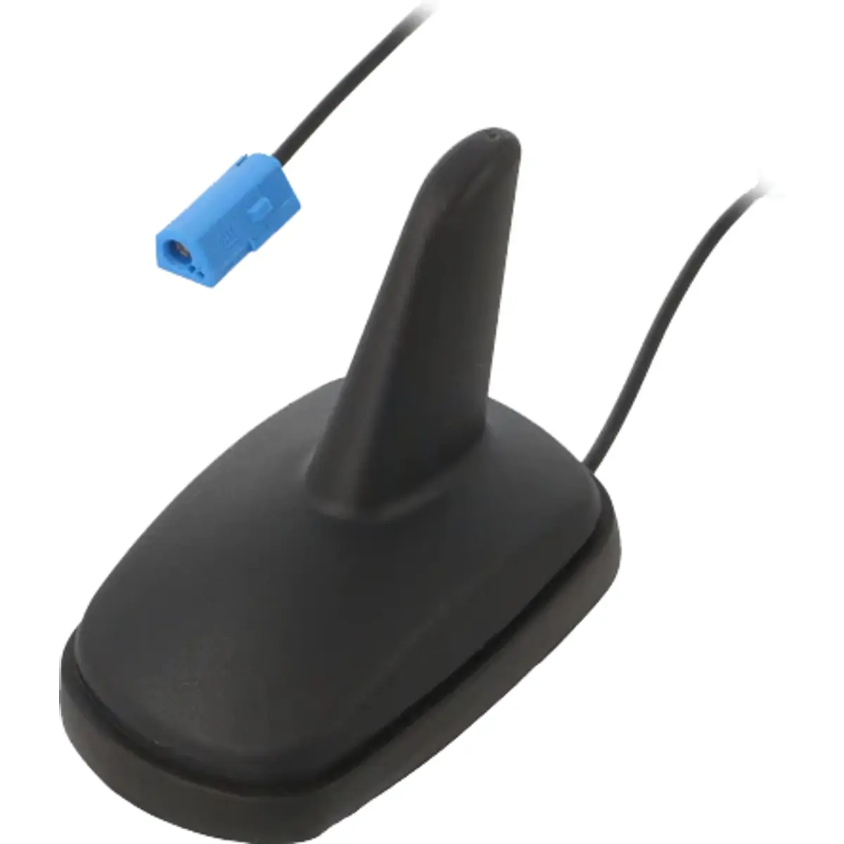 Antena externa amplificada para automóvel, tipo SHARK, com conector RG174 e alimentação de 12V DC via cabo coaxial. Cor preta. Frequência FM de 87-108 MHz e impedância de 75 Ω. Abertura de montagem Ø15 mm e cabo AM/FM de 0,5 m.