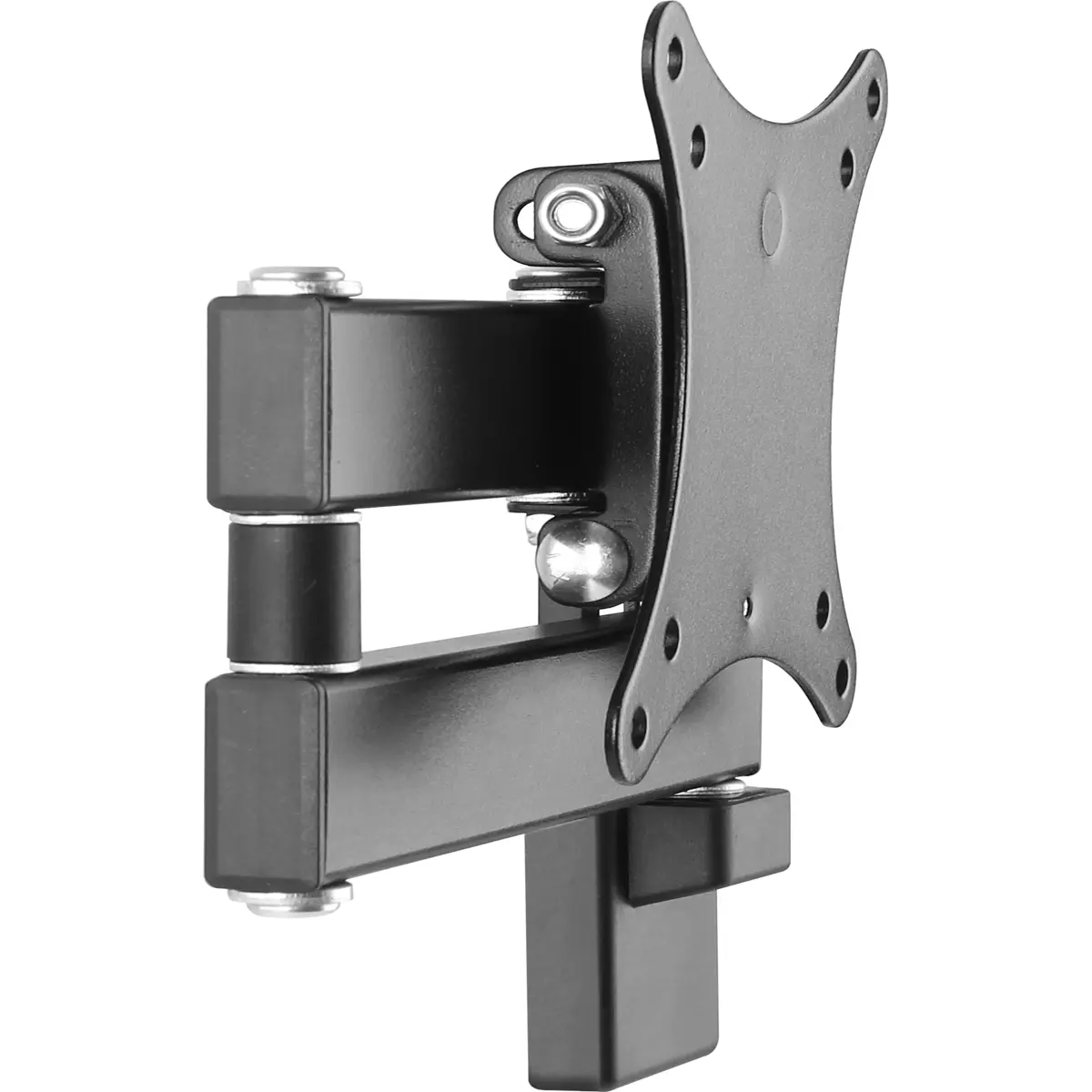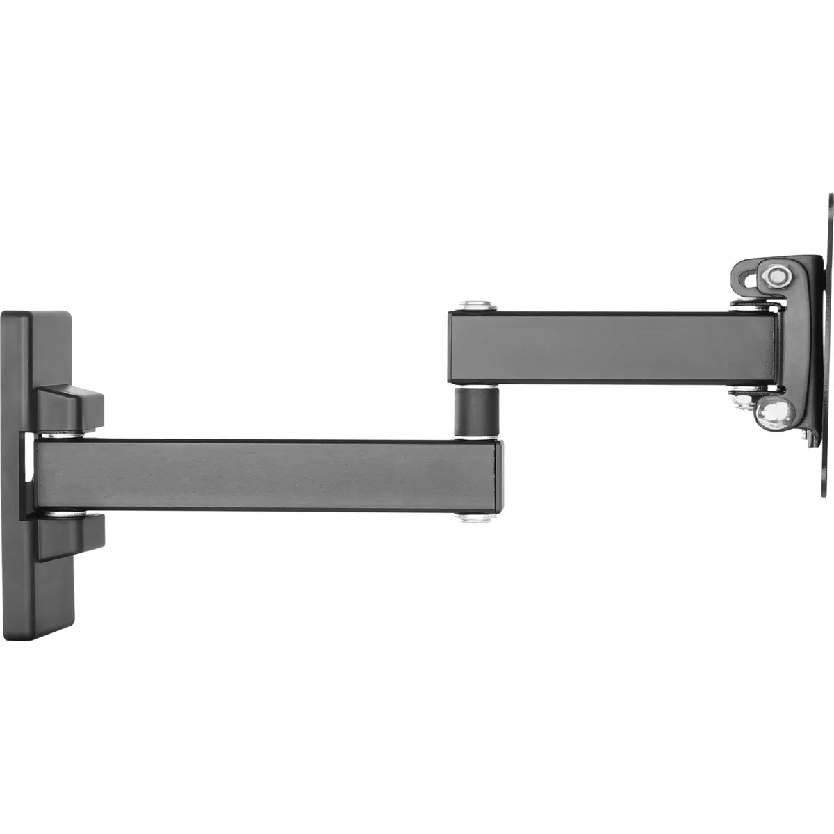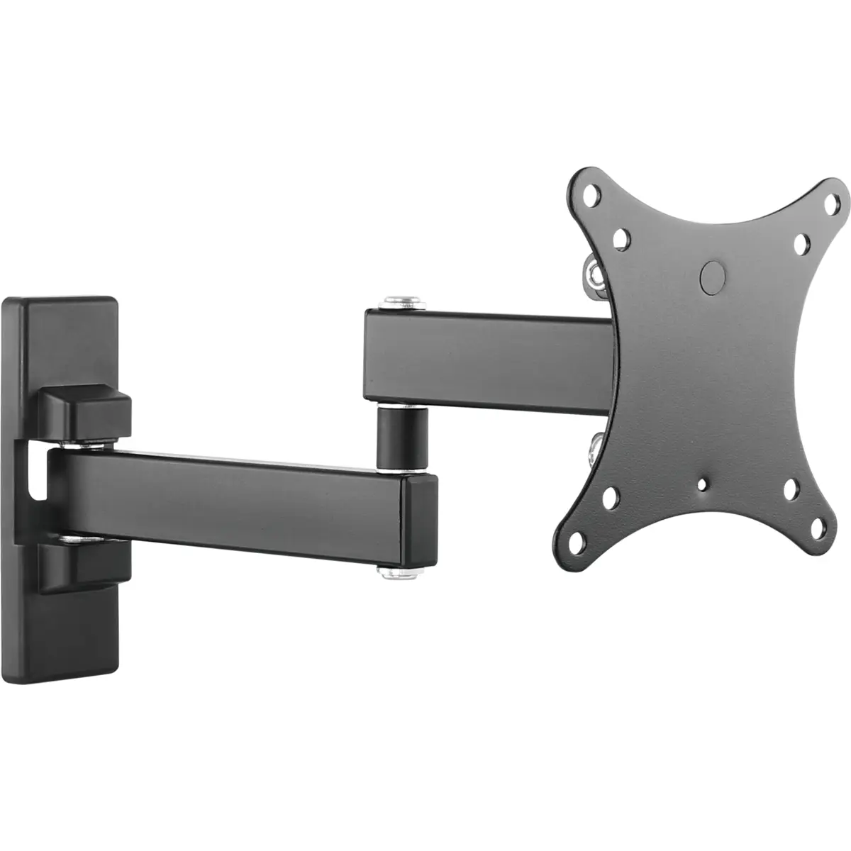 Suporte de parede com braço articulado compatível com TVs de 13 a 27 polegadas (33 a 69 cm) e peso até 15 kg. Fabricado em aço e plástico, suporta VESA 75x75 e 100x100. Permite inclinação de +3° a -10°, rotação de +90° a -90° e nivelamento de +3° a -3°. A distância da parede à TV varia entre 44 e 282 mm. Preto, adequado para instalação em casa ou escritório, com ajuste simples de posição e orientação.