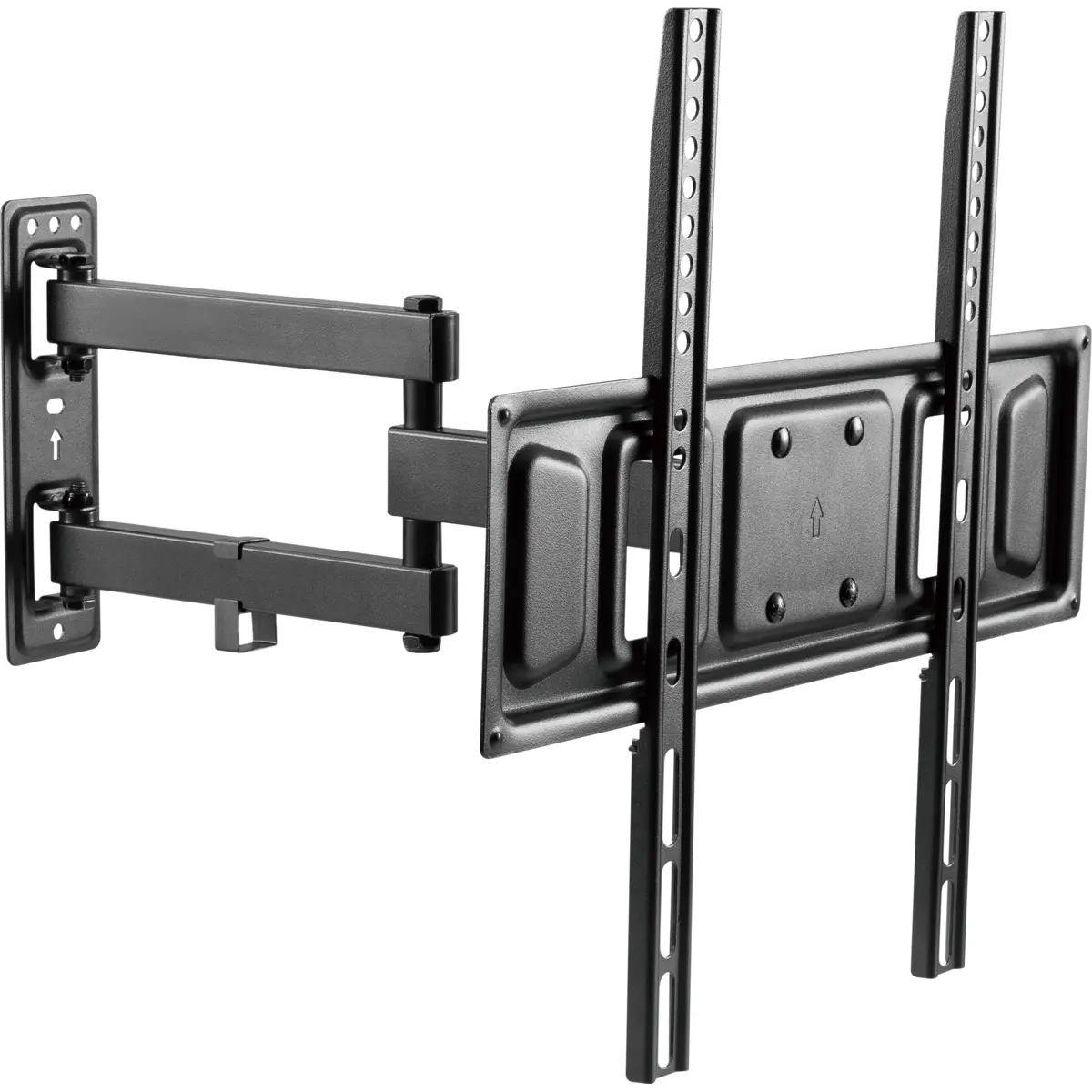Suporte de parede com braço duplo para TV de 32 a 55 polegadas, com articulação, inclinação de +10° a -15°, rotação de +90° a -90° e nivelamento de ±3°, oferecendo ajuste fino e conforto de visualização. Compatível com padrões VESA variados (75x75 até 400x400) e capacidade de carga até 35 kg. Construção em aço e plástico, com distância da parede ajustável entre 71 e 431 mm. Ideal para salas de estar, escritórios e quartos, proporcionando montagem discreta, estabilidade e facilidade de montagem.