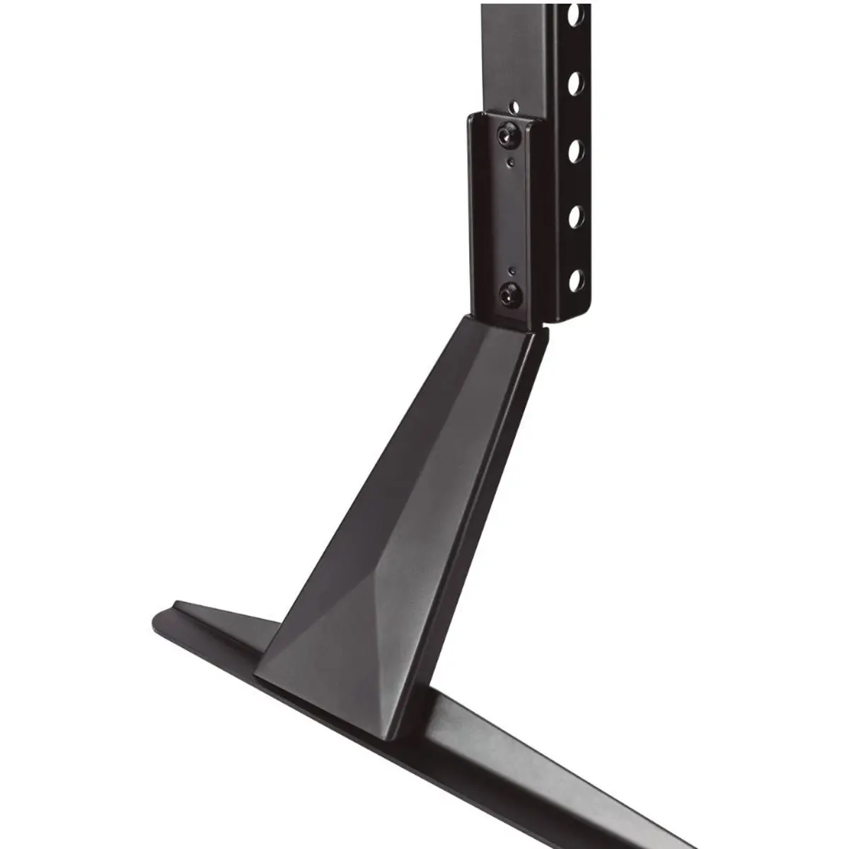 Este suporte de mesa ajustável para LCD suporta televisões entre 23 e 75 polegadas, com peso máximo de 40 kg. A distância de montagem varia entre 673 e 735 mm, e é compatível com os padrões VESA 200x200, 300x200, 300x300, 400x200, 400x300, 400x400, 600x400 e 800x400. Fabricado em aço e plástico, com acabamento preto, é adequado tanto para televisões planas como curvas.