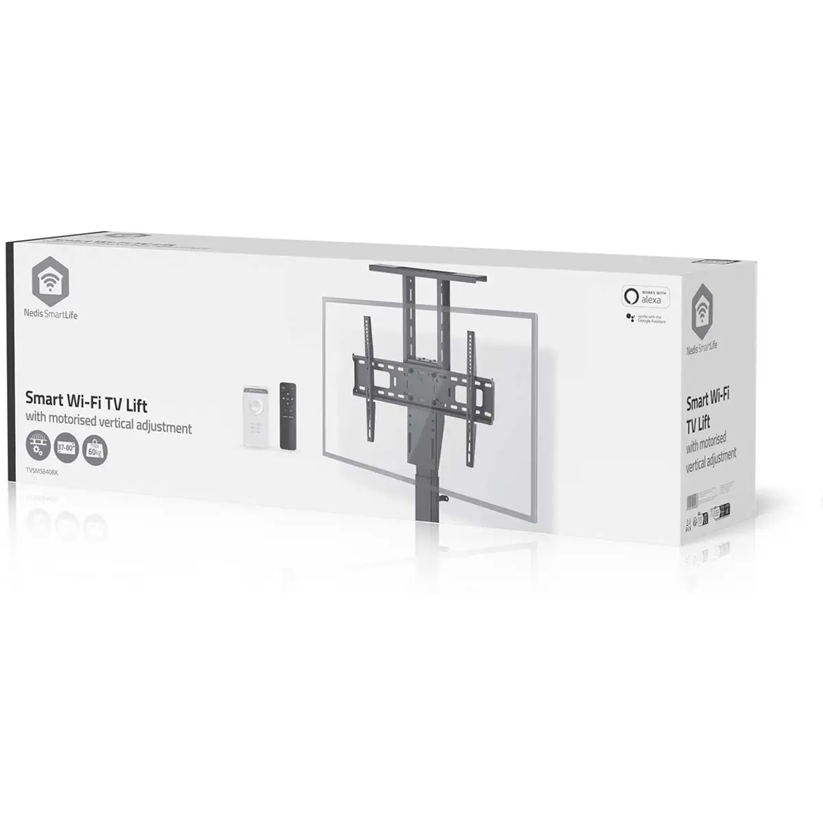 O Elevador de TV Motorizado Nedis SmartLife Wi-Fi foi projetado para ocultar televisores de ecrã plano com tamanhos entre 37" e 80" em armários. O painel superior do armário pode ser montado no suporte, permitindo selar a caixa quando o elevador está baixado. Esta solução não só economiza espaço, mas também contribui para um ambiente minimalista.