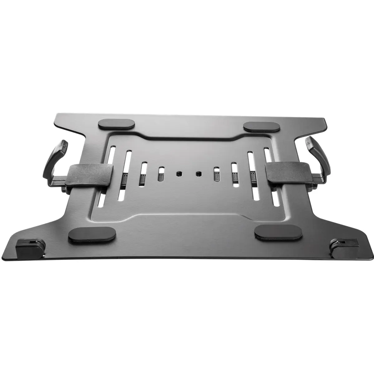 Este suporte para portátil é ideal para configurações de monitor único ou duplo no ambiente de trabalho moderno. Fixado à placa de montagem de um braço de monitor, transforma-se num suporte seguro para o portátil, permitindo uma posição ergonómica e confortável. Graças à sua versatilidade, pode ser utilizado como bandeja horizontal para projetores, dependendo do ângulo de inclinação do braço do monitor.
