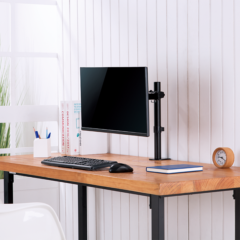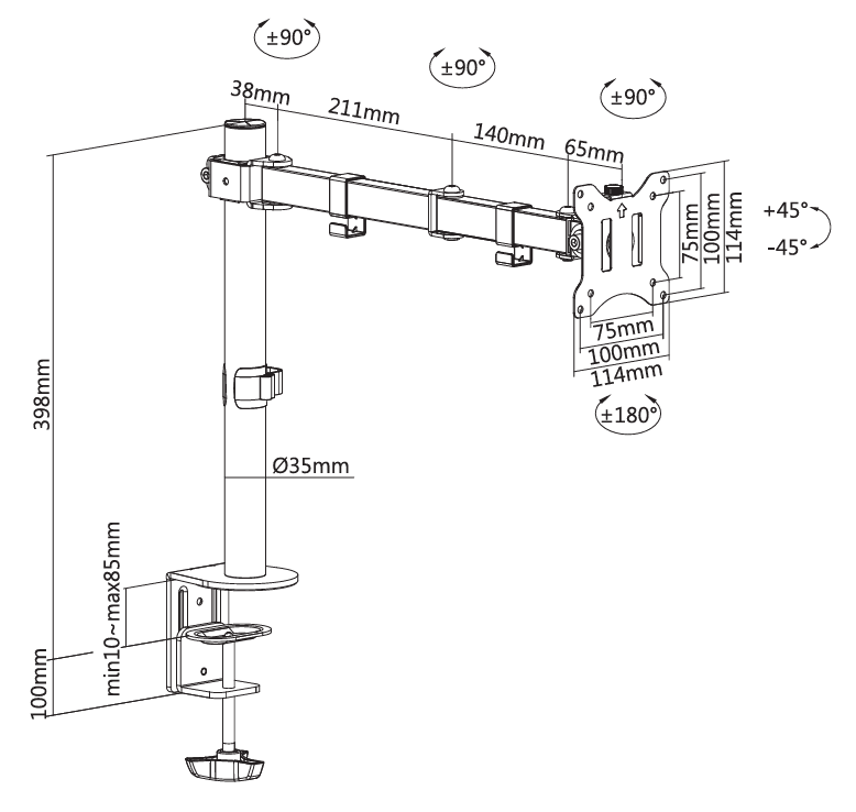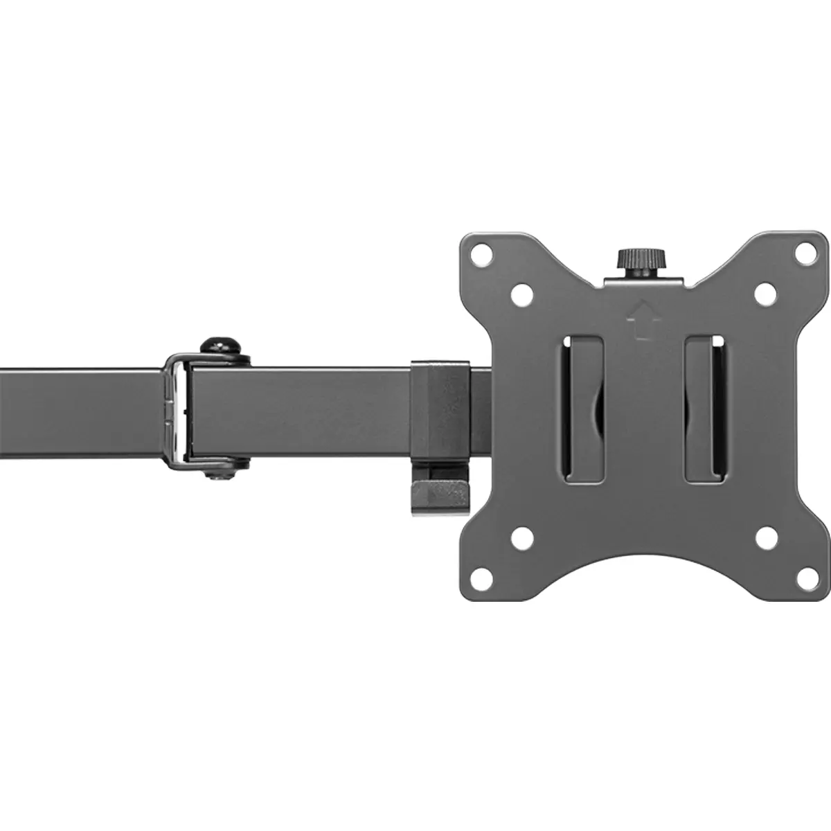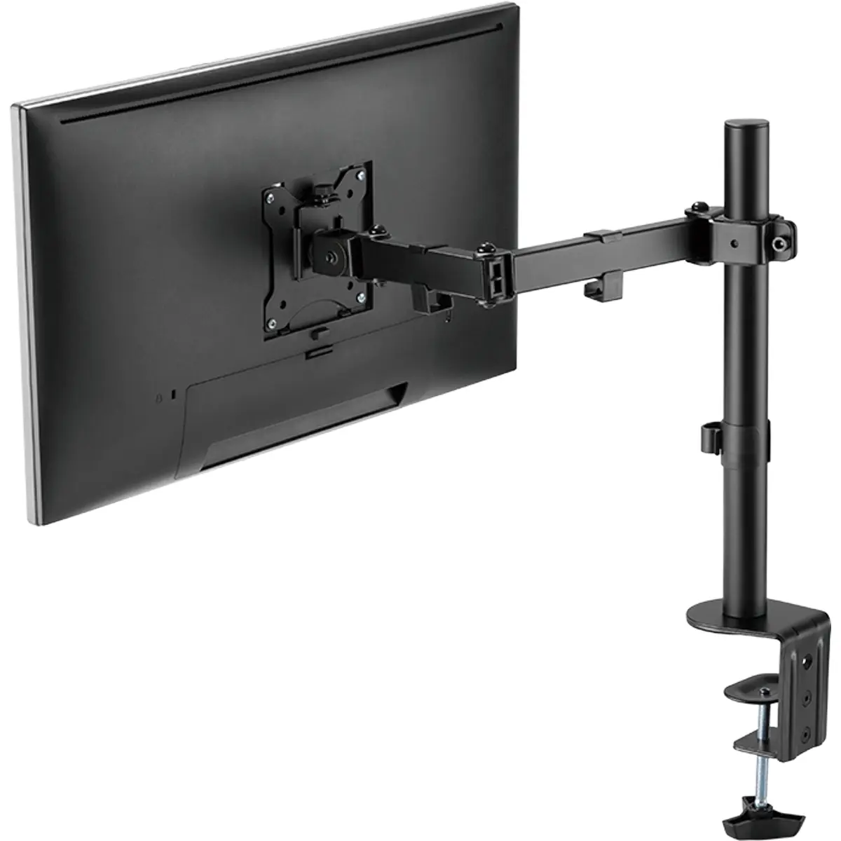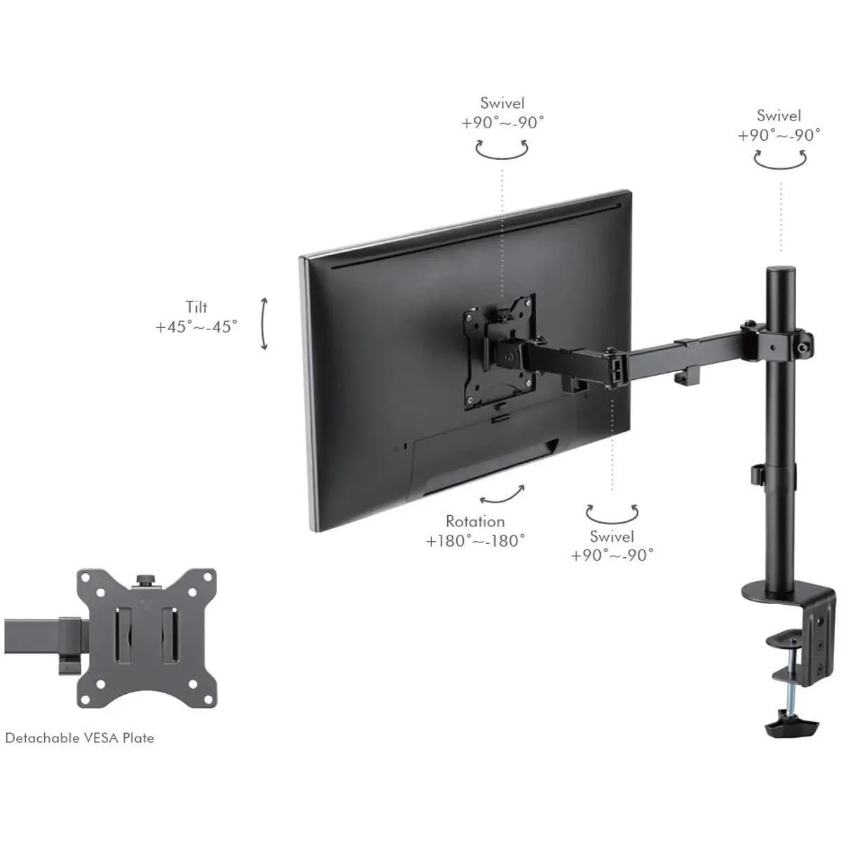 O suporte de mesa ajustável suporta monitores entre 17 e 32 polegadas, com carga máxima de 8 kg. O braço estende-se até 390 mm e oferece inclinação de -45° a +45°, rotação de 180° e painel frontal rotativo de 360°. Compatível com VESA 75x75 e 100x100. Ideal para montagem por braçadeira de mesa, com gestão de cabos integrada e altura ajustável para uma posição ergonómica. Inclui acessórios de montagem e vem na cor preta.