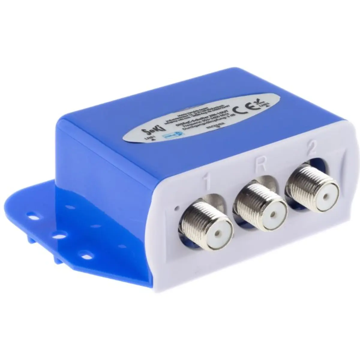 Comutador DiSEqC 2x1 com caixa externa à prova de intempéries para instalação externa. Permite ligar duas entradas a uma saída, operando entre 950 e 2400 MHz com perdas inferiores a 2 dB e impedância de 75 ohms. Consumo de energia de 15 mA e carga máxima de 500 mA, ideal para montagem em mastro ou parede. Projetado para ambientes expostos, oferece proteção contra humidade e neve, assegurando desempenho estável em condições climáticas adversas.