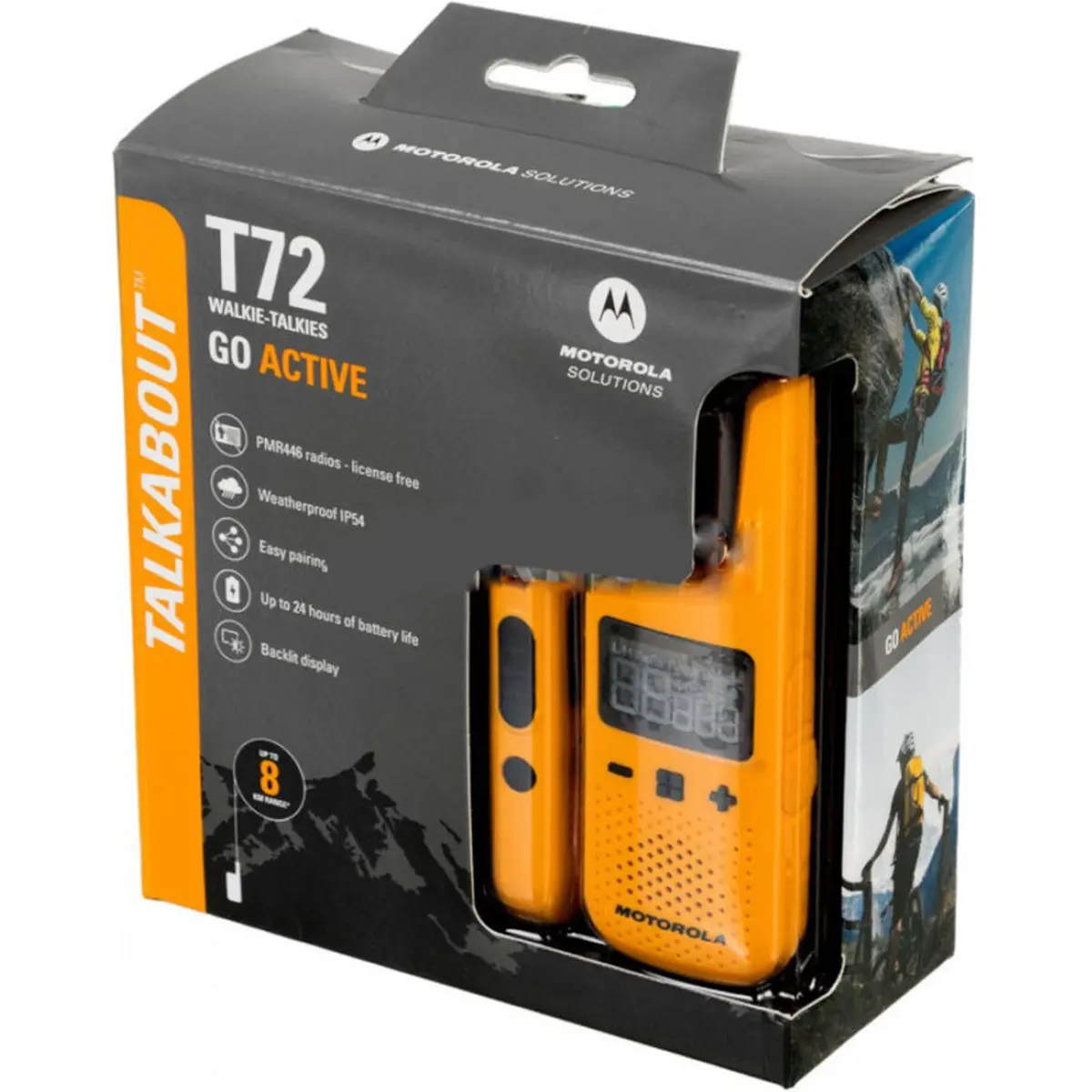 O Motorola TLKR T72 é um walkie talkie robusto e confiável, ideal para utilização em ambientes extremos ou durante atividades ao ar livre. Opera na frequência PMR446, sem necessidade de licença, oferecendo comunicação gratuita em 16 canais e 121 subcanais, com alcance máximo de até 8 km, sujeito a condições de terreno, clima e interferências.