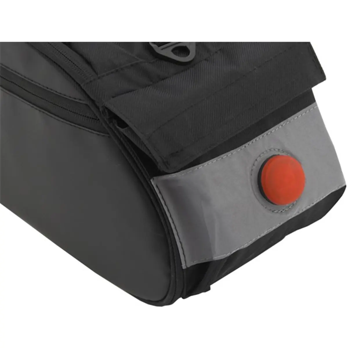 O material é resistente e fácil de limpar, enquanto a parte traseira é equipada com uma superfície refletora e iluminação LED, garantindo segurança em condições de visibilidade reduzida. A lanterna LED pode ser ligada pressionando-a, oferecendo modos de luz intermitente e luz fixa.